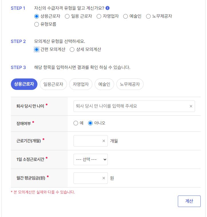 퇴사당시 만 나이, 장애여부, 근로기간, 1일 소정근로시간, 월간 평균 임금을 입력하고 "계산"누르시면