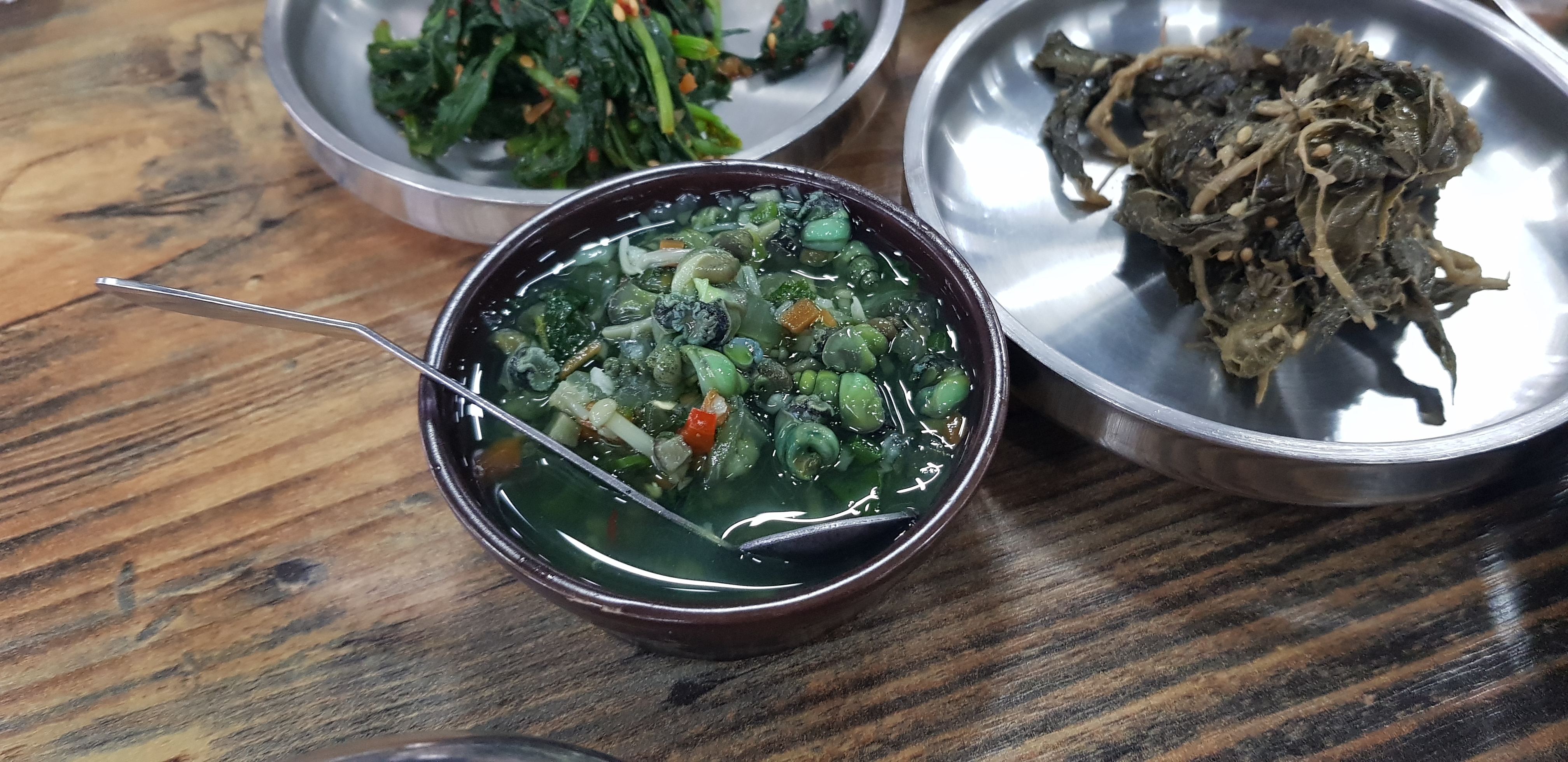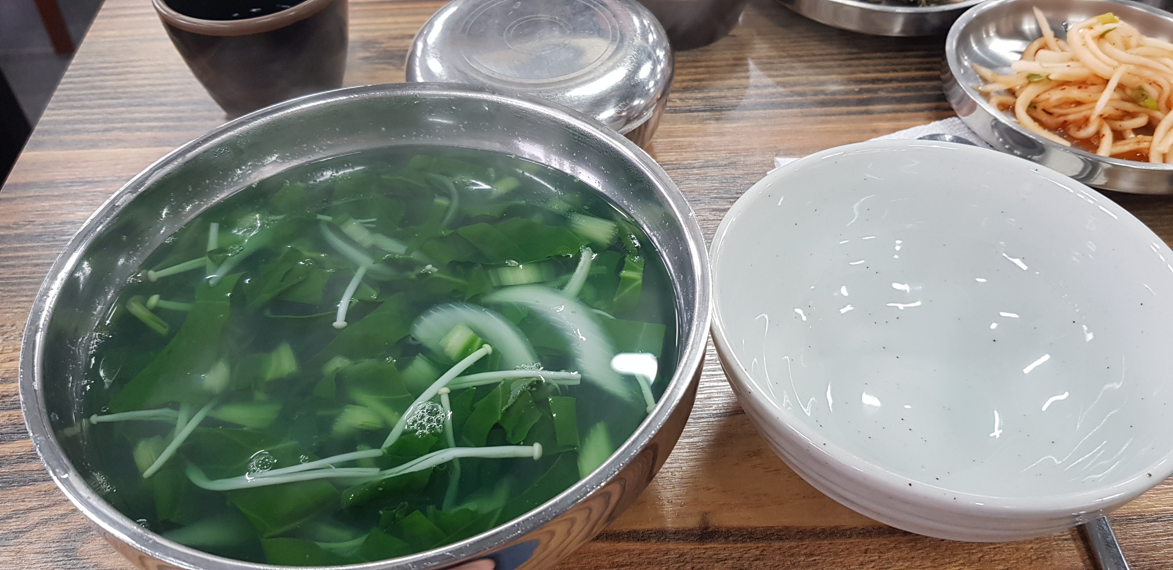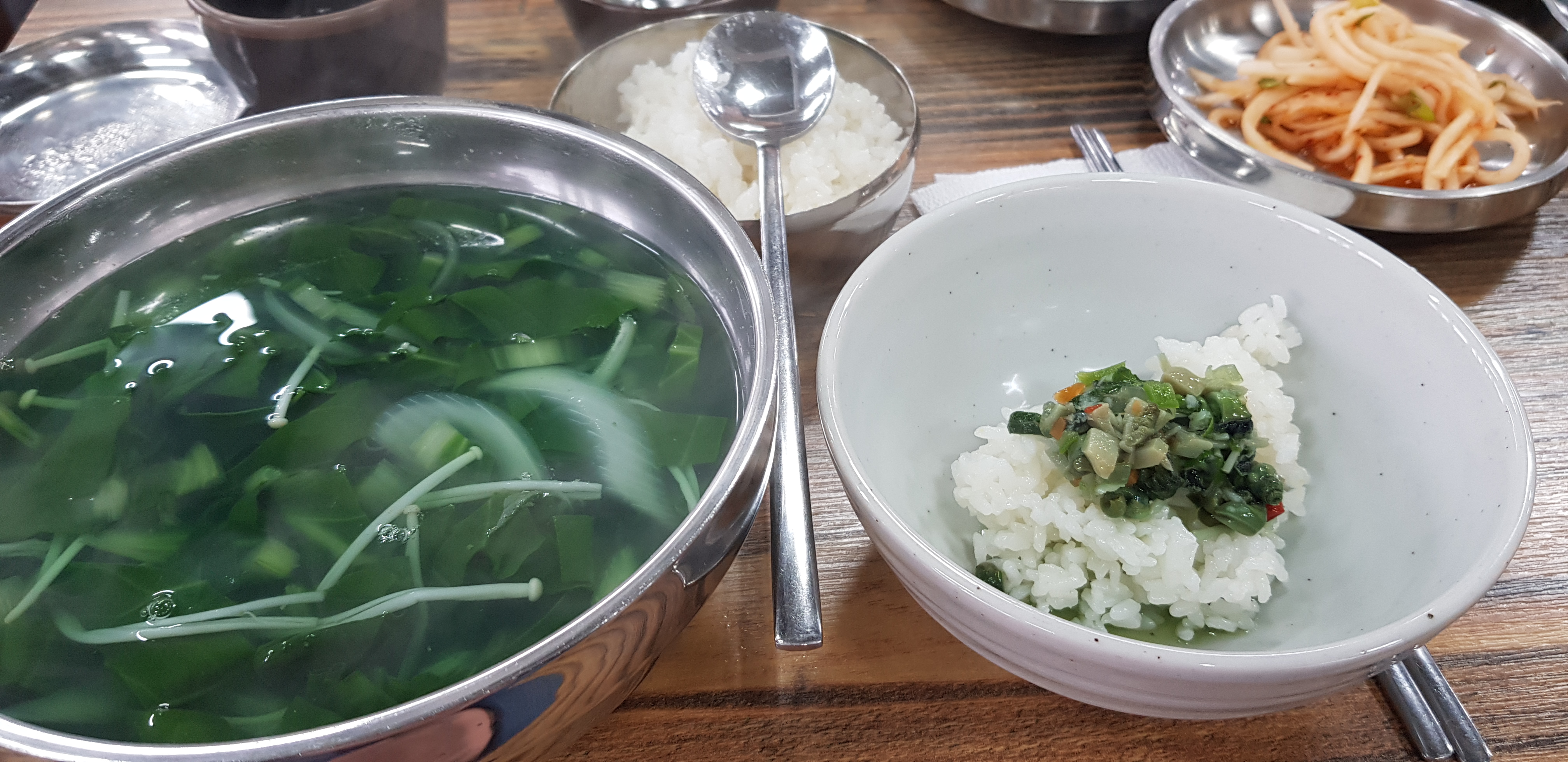 생다슬기탕이 나왔습니다. 다슬기와 근대를 넣고 끓인 다슬기탕입니다. 근대의 시원한 맛과 다슬기가 맛나니 잘 어울리는 맛입니다. 깐다슬기장도 서비스로 밥 비벼 시식해보라고 주셨습니다. 깐다슬기장에는 짭쪼름한 맛과 방아나 산초 같은 향신료 맛이 났어요.