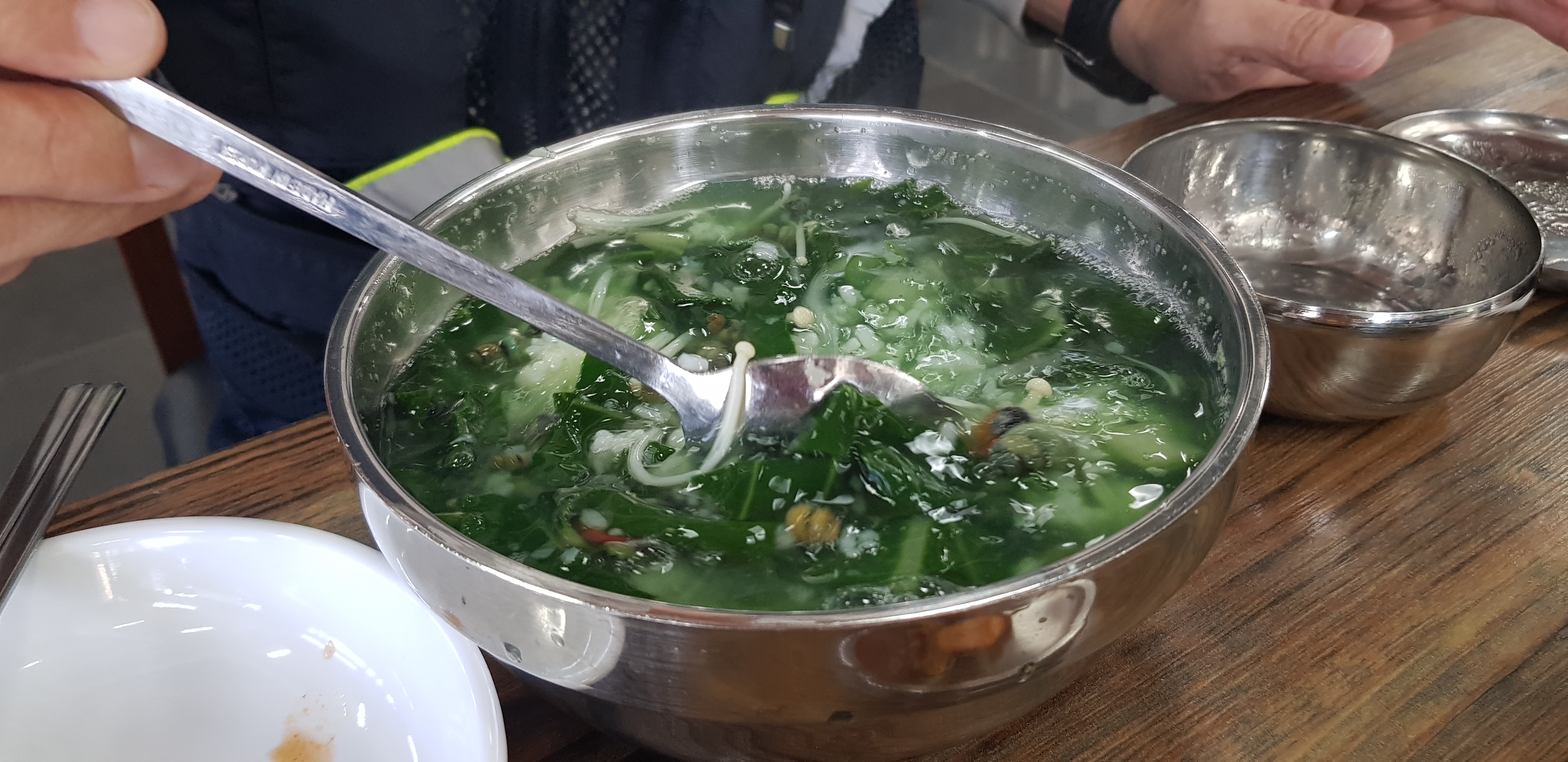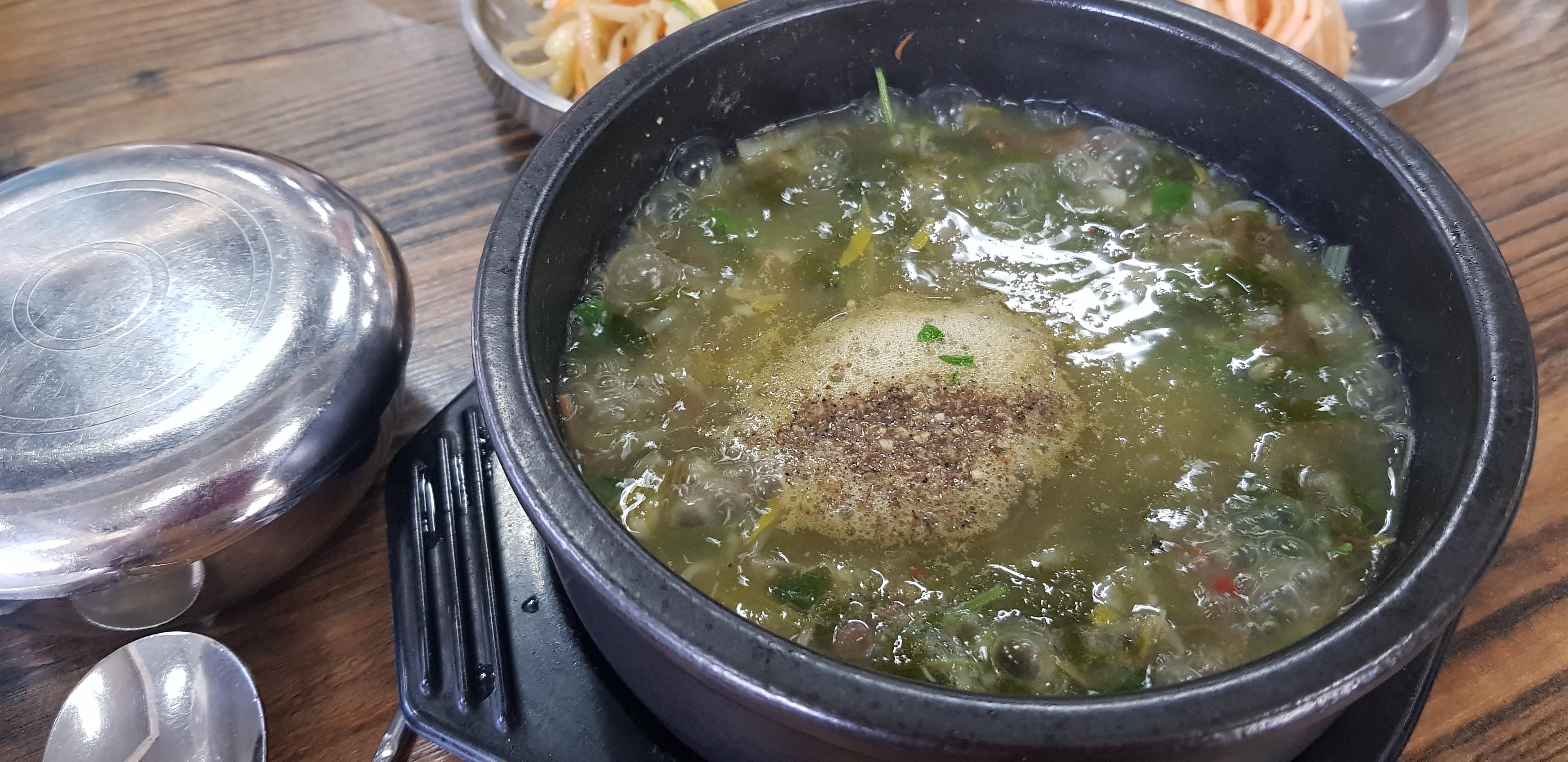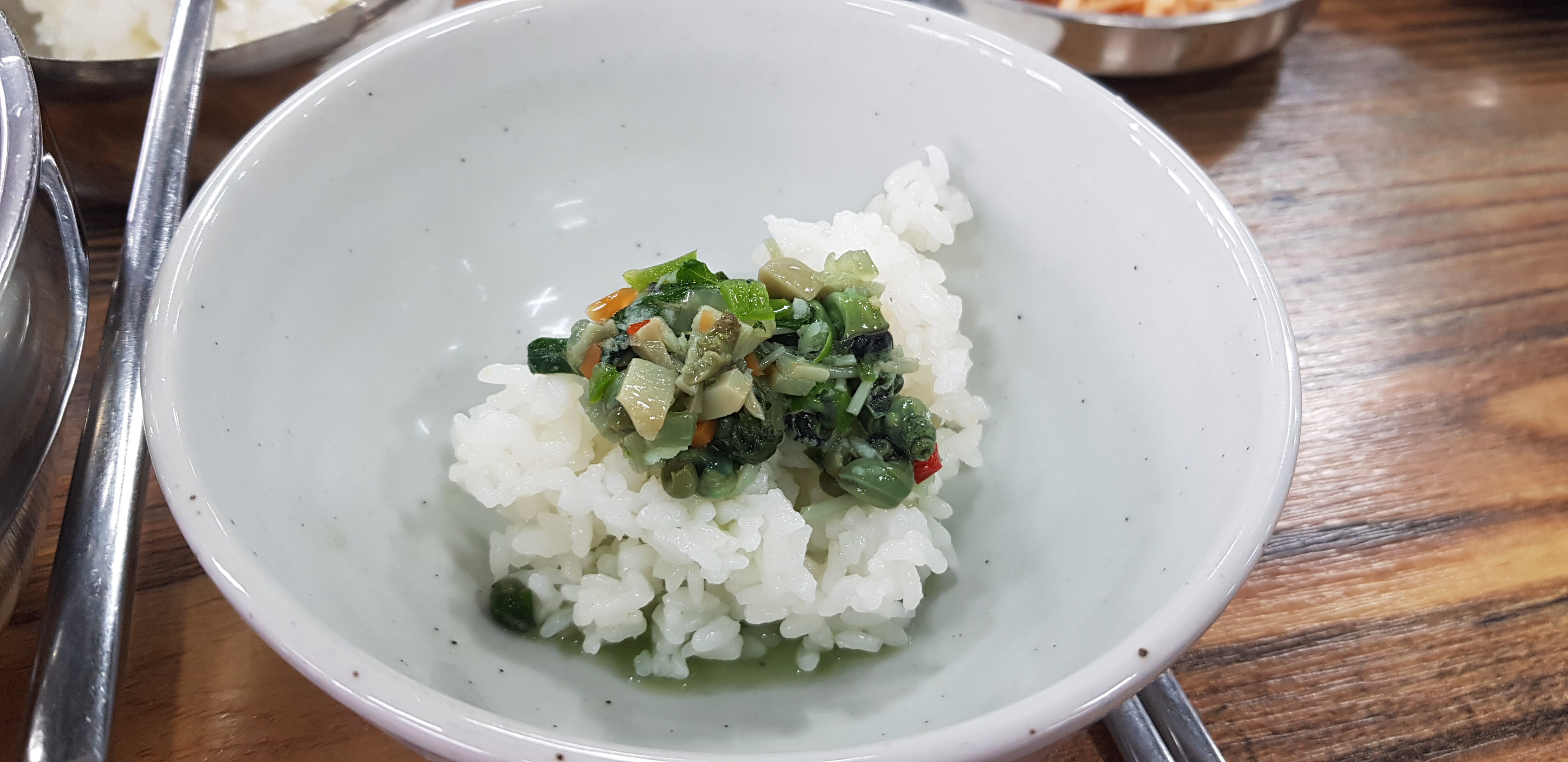 생다슬기탕이 나왔습니다. 다슬기와 근대를 넣고 끓인 다슬기탕입니다. 근대의 시원한 맛과 다슬기가 맛나니 잘 어울리는 맛입니다. 깐다슬기장도 서비스로 밥 비벼 시식해보라고 주셨습니다. 깐다슬기장에는 짭쪼름한 맛과 방아나 산초 같은 향신료 맛이 났어요.